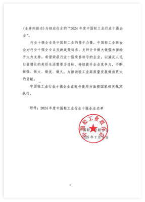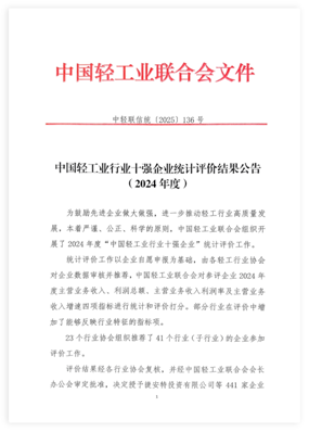 2025年7月9日,中國輕工業(yè)聯(lián)合會發(fā)布《中國輕工業(yè)行業(yè)十強(qiáng)企業(yè)統(tǒng)計(jì)評價(jià)結(jié)果公告》(中輕聯(lián)信統(tǒng)(2025)136號),發(fā)布了我國輕工業(yè)各行業(yè)的“2024年度中國輕工業(yè)行業(yè)十強(qiáng)企業(yè)”名單。